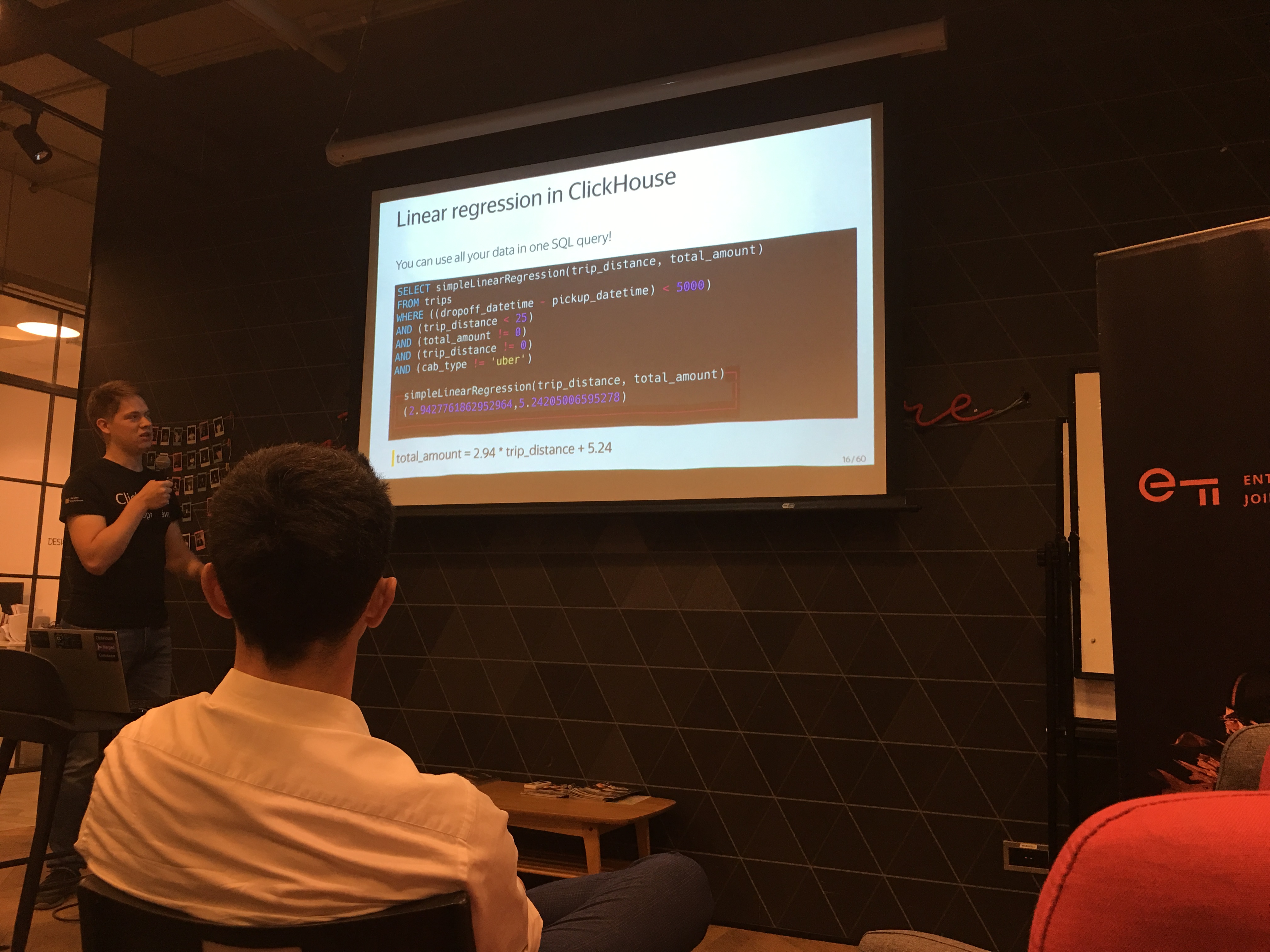 ClickHouse core developer Nikolay Kochetov presented how to do some Machine Learning in ClickHouse. He used some Uber dataset which describes rides in the city of New York for the purpose of illustration. Only using SQL-like requests, he was able to fit and predict from simple linear models to stochastic linear and logistic regressions. It is possible to use CatBoost, another great open sourced Yandex product - a Gradient Boosting model well suited for categorical variables, to predict on data stored in ClickHouse.