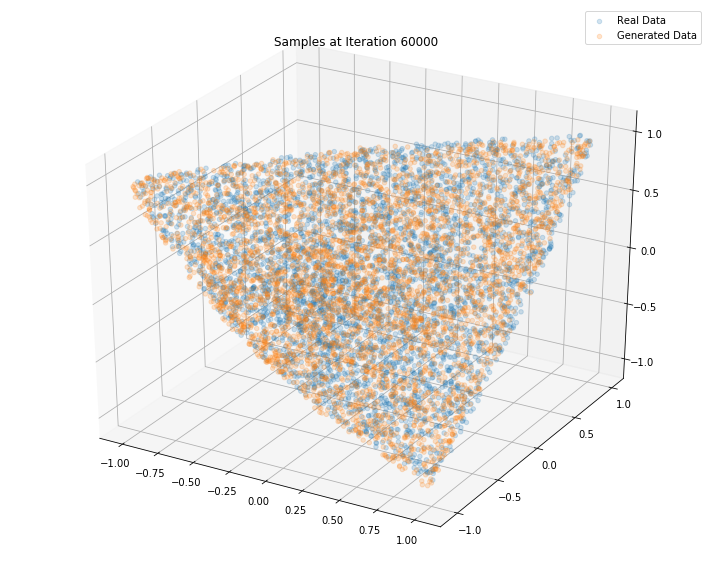Below some code that allows to sample nearly correctly from the 3D elliptope. Notice that a few points are living outside the hull. They correspond to 3x3 matrices which are not positive semidefinite (hence not proper correlation matrices). Notice that, here, we generate only 3 coefficients since out of the 3x3=9 coefficient, only n(n-1)/2 = 3 matters (3 being forced to 1 (diagonal), 3 are defined by the symmetry). We could ask the GAN to learn the diagonal property (=1) and the symmetry property (C = C^T), but that would make the problem uselessly harder.