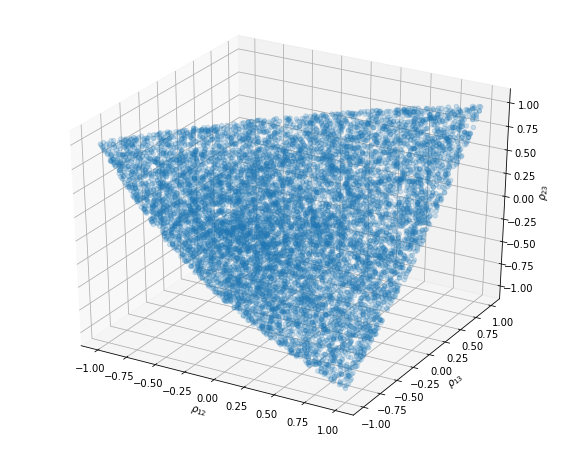 Before trying to sample from any ‘complex’ subset of the N-dimensional elliptope, let’s focus on the full 3-dimensional elliptope (which corresponds to the set of 3x3 correlation matrices). At least,