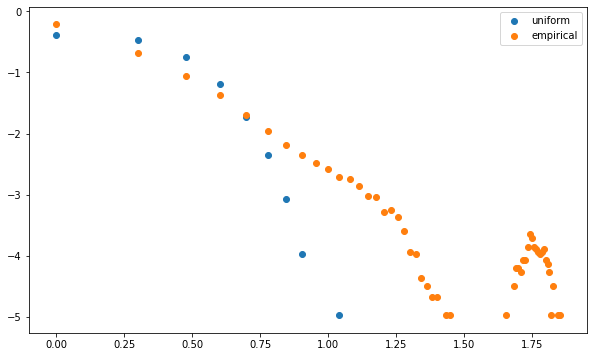 plt.scatter(np.log10(mean_unif_counts.index), np.log10(mean_unif_counts), label='uniform')